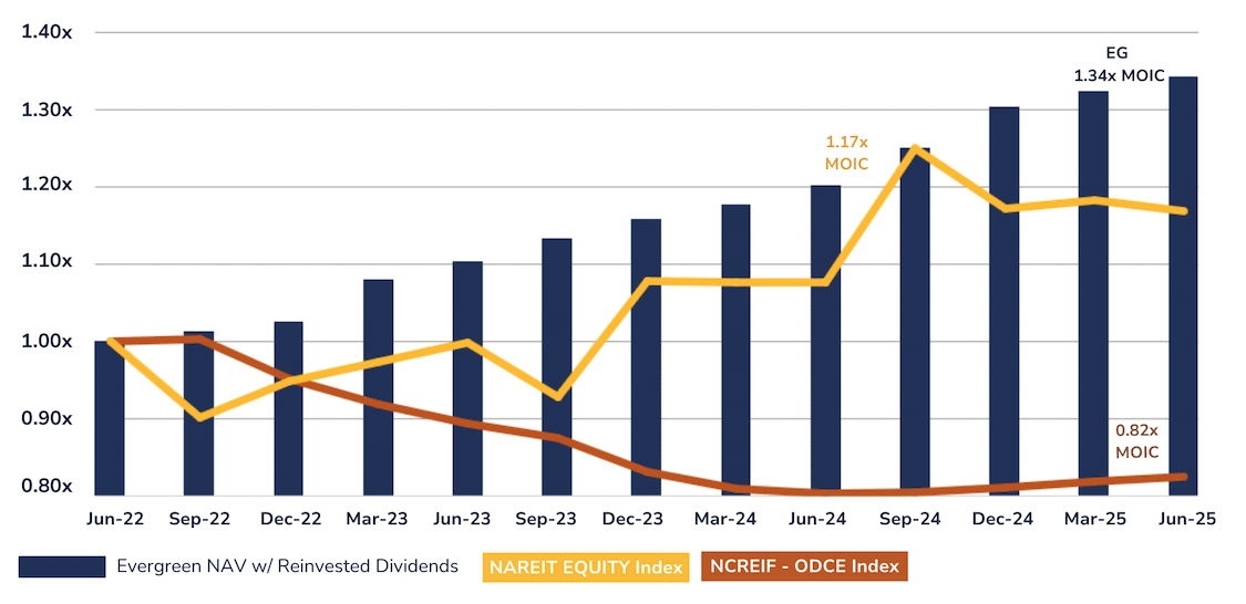 Since its inception, Evergreen has outperformed both the public equity REIT index (NAREIT) and the private REIT index (NCREIF).